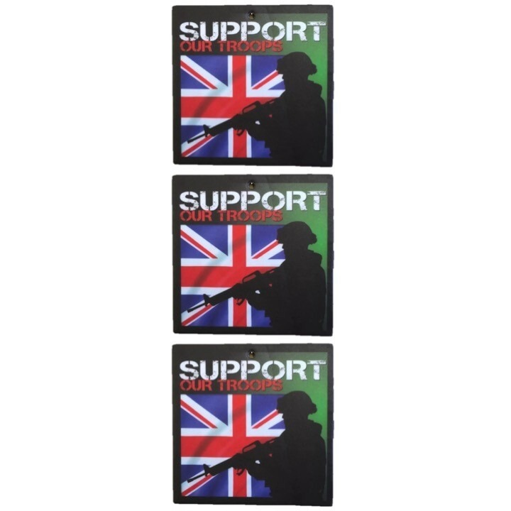 Support our Troops sign also picturing a Union Jack and a combat soldier