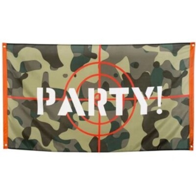 Lock and load your party with this camouflage flag! This bold army flag features the classic camouflage background with red crosshairs motif and a large ‘PARTY!’ slogan, the flag will catch the eye of all your guests and tell your soldiers where to report to. The perfect addition to Army or Military themed parties, and even welcome home parties.